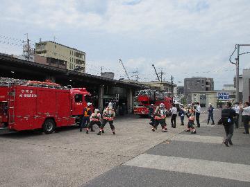 合同訓練では、市バスのエンジンからオイルが漏れ、エンジンの熱で発火し、保管中のタイヤに延焼拡大しているとの想定で、運転手の救出や大型はしご車の塔上放水を実施しました。