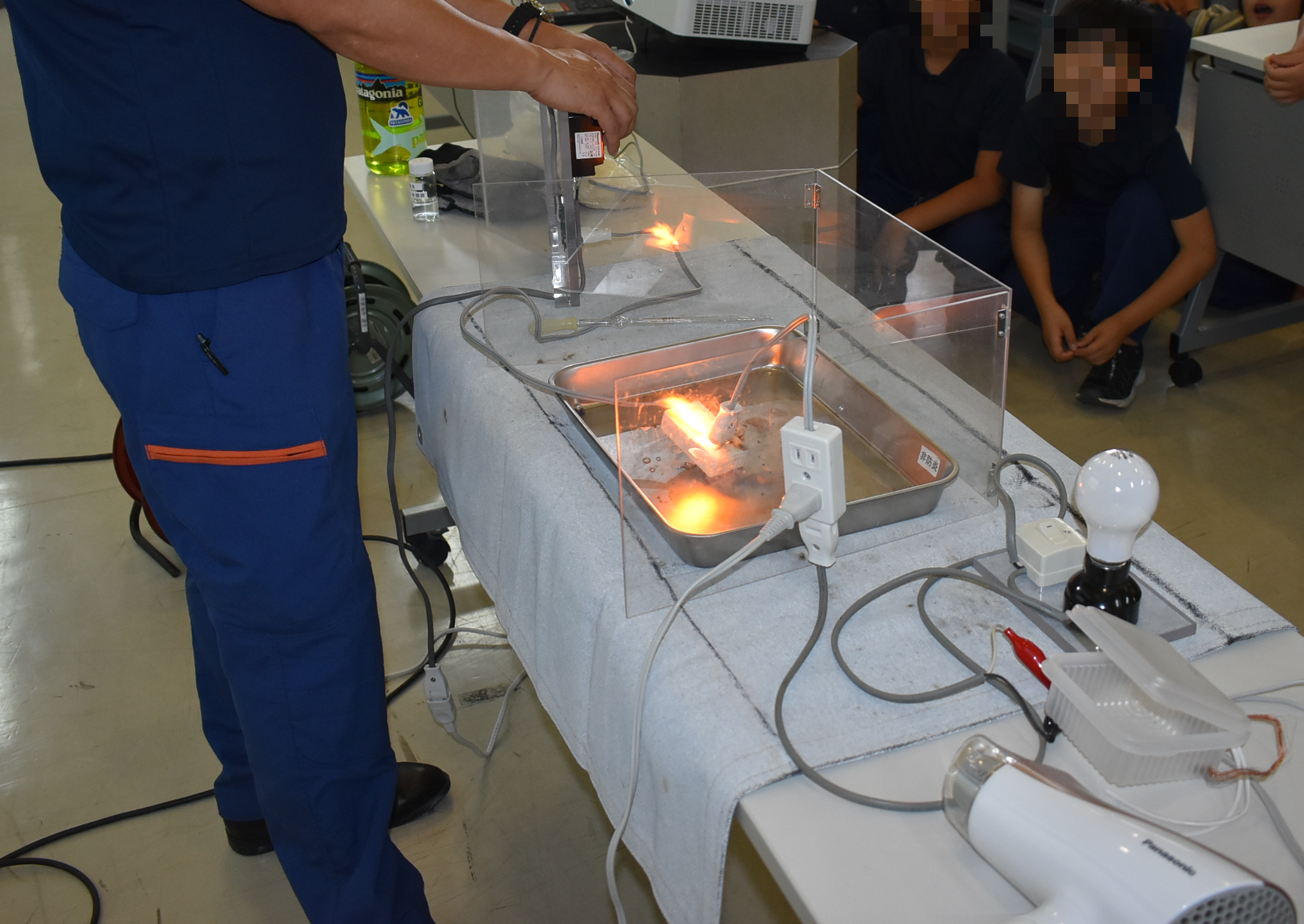 電気火災の実験を見学して、コンセントとプラグの間から勢いよく炎が出た時は、