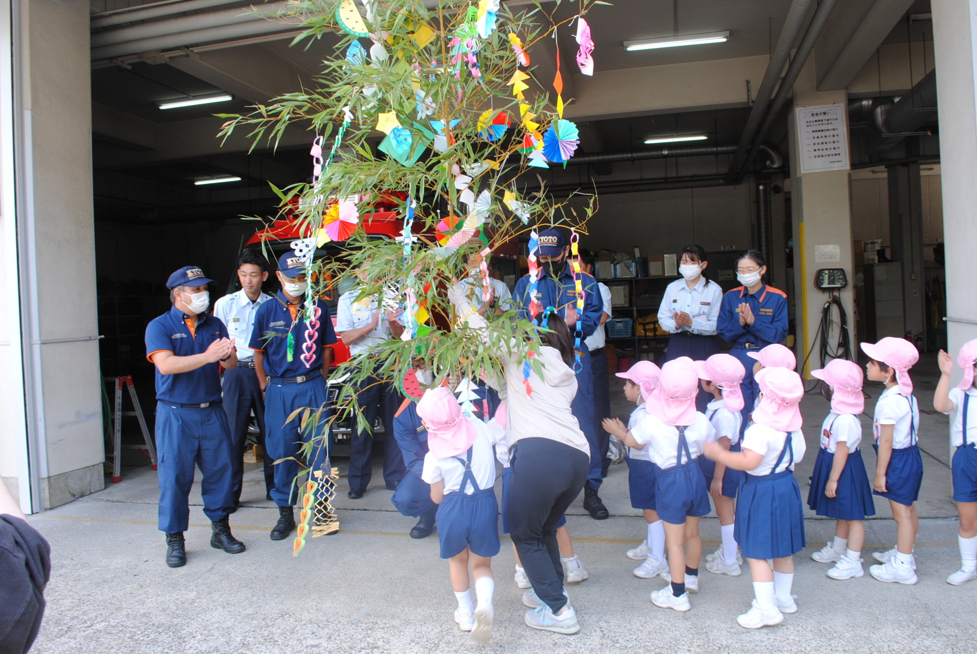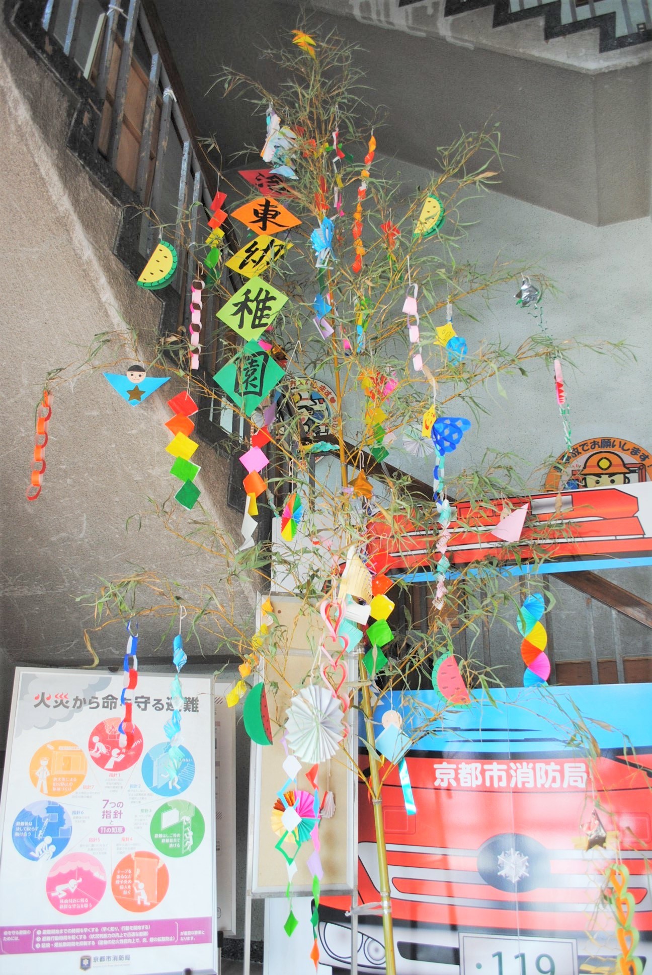 令和5年7月3日(月曜日)、洛東幼稚園の子供たちが、防火・防災の願いを込めた七夕の笹飾りを、山科消防署に届けてくれました。