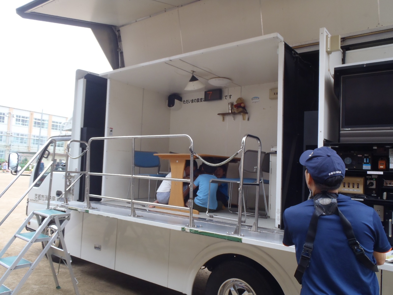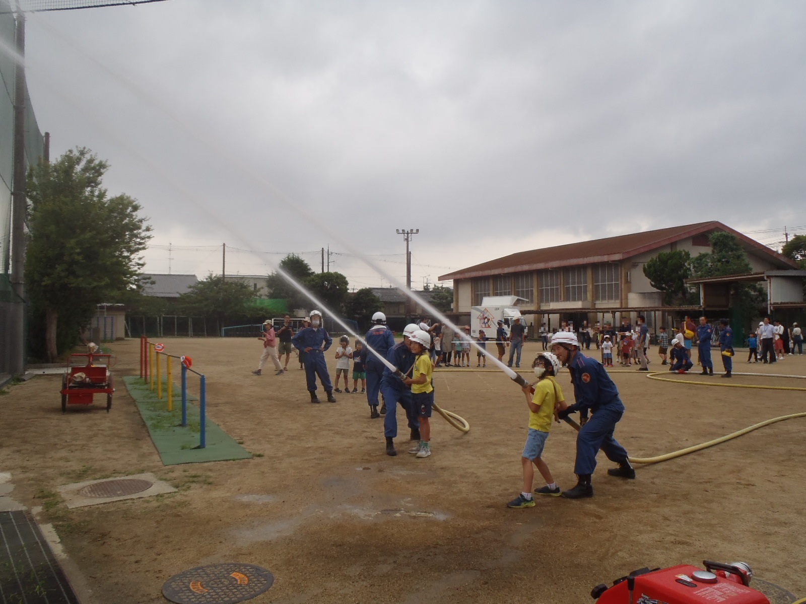 動力ポンプを使って筒先から放水する放水体験、起震車での地震体験、視界ゼロの煙の中で物を探す煙中検索体験を児童や保護者に体験してもらいました。