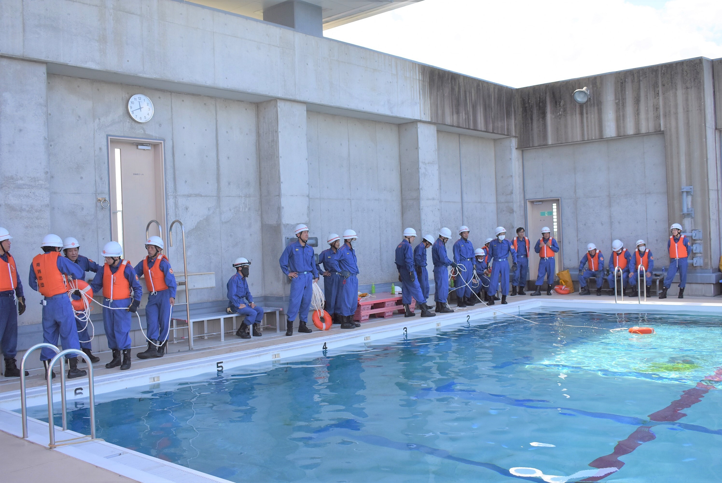 最後は水上訓練場で、浮環とフローティングロープを使用した投てき訓練を実施しました。浮環とフローティングロープを片手だけで保持するのは難しく、「前に飛ばす」「遠くへ飛ばす」のは思っていた以上に苦戦し、習得するために何度も浮環を投げました。