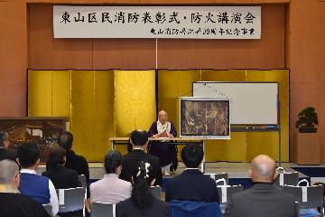 式典後は、清水寺貫主 森 清範氏をお招きし、「寛永の大火 助けられた絵馬」との題目で文化財防火の講演を行っていただきました。講演の中で森氏は、寛永6年(1629)の大火災によって清水寺の建物のほとんどが全焼したものの、重要文化財である絵馬「朝比奈草摺曳図」(長谷川 久蔵作)については寺関係者による必死の搬出のおかげで現存していることに触れられ、「火災など災害から大切な文化財を守り、未来へ引き継ぐことが現代に生きる我々の役目です。」と聴講者に呼び掛けられました。