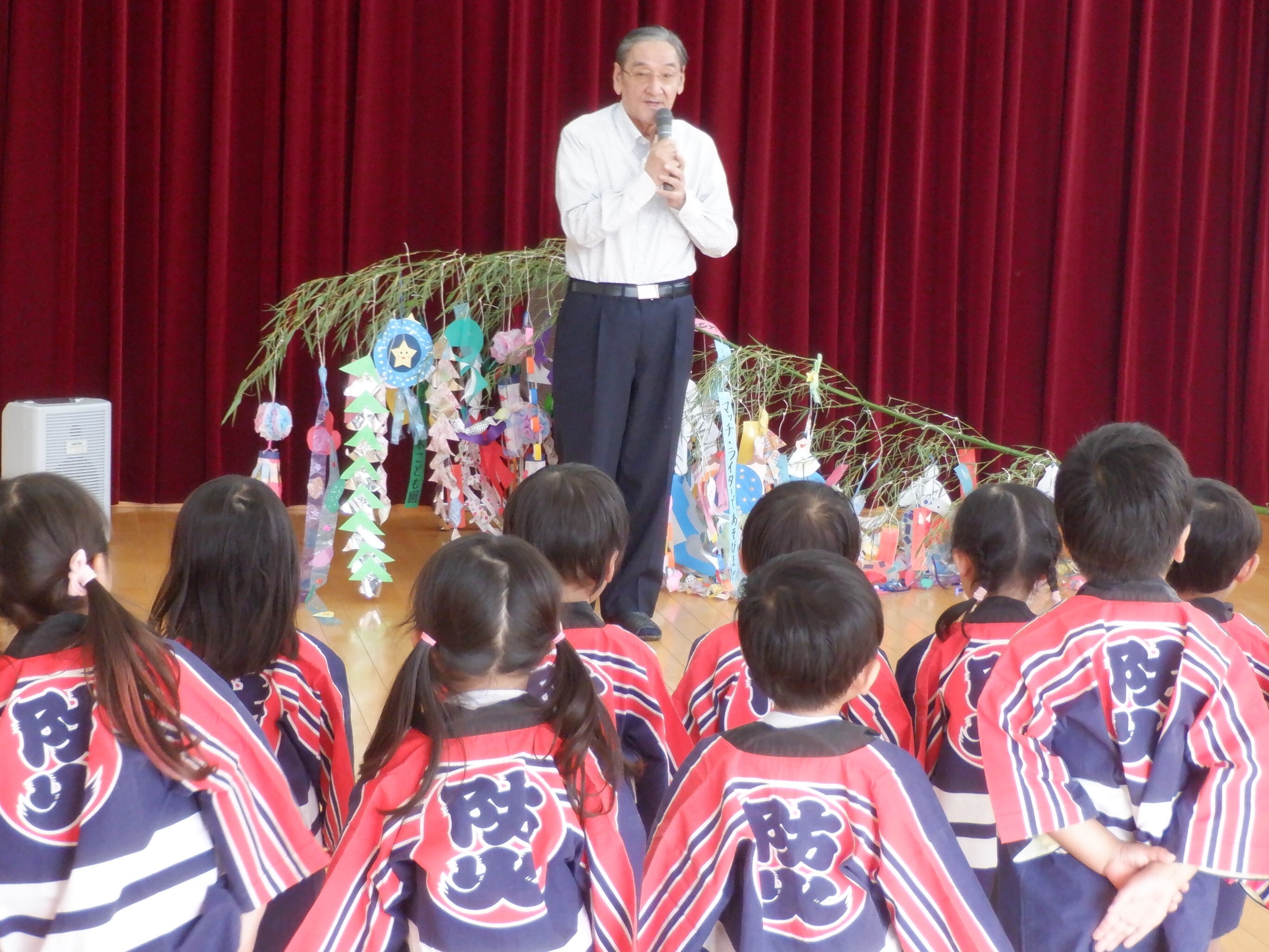 園で行われた贈呈式では、片山 定嗣(かたやま さだつぐ)園長が「皆の願いがかなうよう一生懸命作った笹飾りを、地域を守ってくれている消防署の方々に感謝を込めて、贈りましょう。」とお話された後、園児たちが元気な声で「マッチやライターで遊びません!」「たき火遊びはしません!」「あぶない花火遊びはしません!」と防火の約束をしてくれました。
