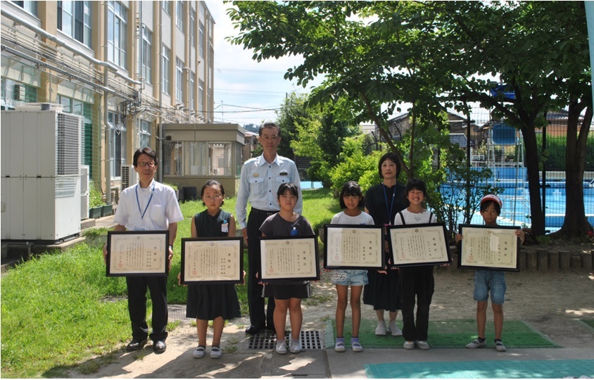 感謝状は、通学する京都市立広沢小学校で、令和6年7月22日に全校生徒の前で右京消防署長から贈らせていただきました。また、感謝状を贈呈された片淵さんは、右京ジュニア消防団に所属しており、同校に通っている同団員も舞台上に上がって、ジュニア消防団の説明と活動についても紹介させていただきました。