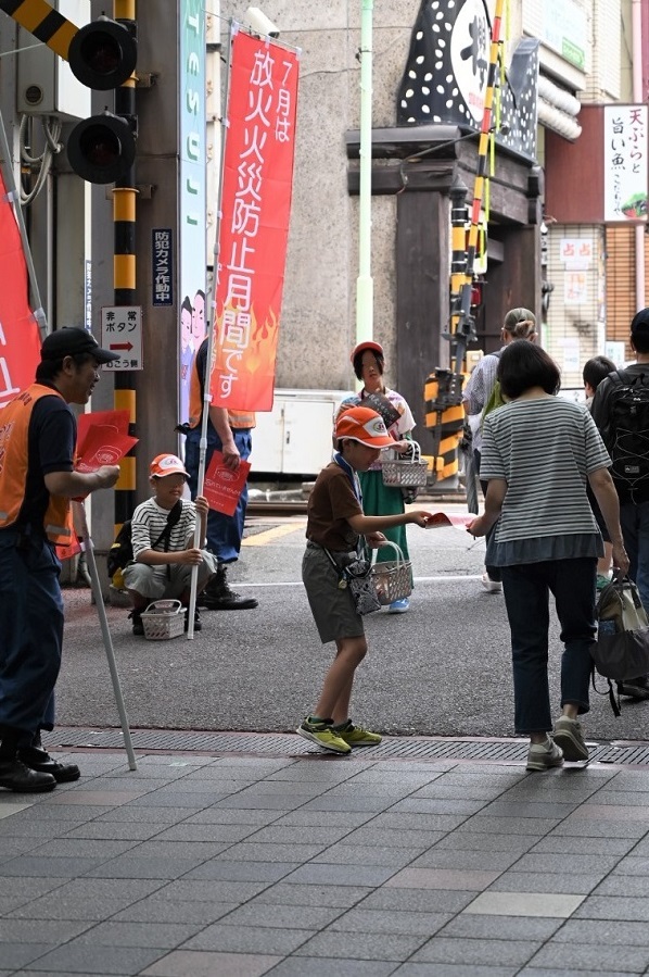 令和6年7月14日(日曜日)には、Bブロック(住吉、板橋、南浜、桃山、向島の各分団)が大手筋通商店街で実施した街頭防火広報に、同じくBブロックのジュニア消防団員も参加し、商店街を歩く方々に放火火災防止を呼び掛けました。