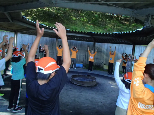 午前6時30分に起床し、部屋の片付けをしてから営火場に集合しました。