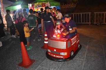 東山消防署では、北消防署からお借りしたミニ消防車の乗車体験や消防車両の展示を行い、東りゅうくんとともに火災予防を呼び掛けました。