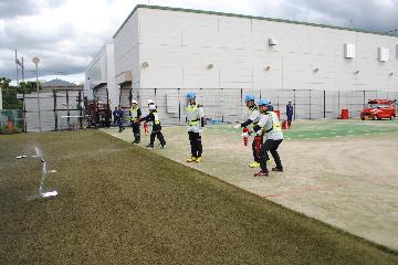訓練は消火器操法、2号消火栓操法、屋内消火栓操法、小型動力ポンプ操法の順に行われ、各自衛消防隊は、日頃の訓練の成果を十分に発揮され、頼もしい姿を披露されました。