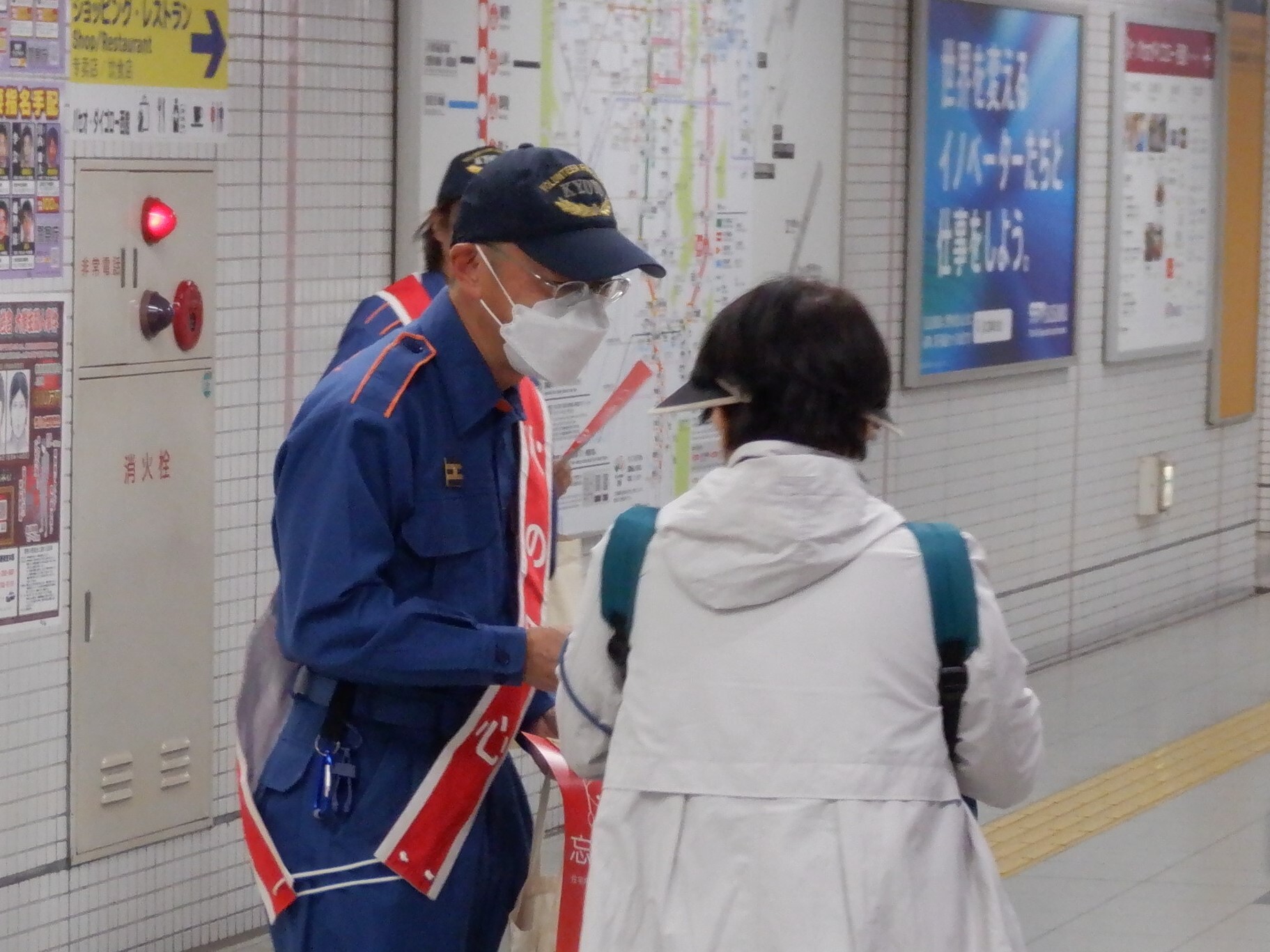醍醐地域においても醍醐地域消防分団(醍醐分団、醍醐池田分団、春日野分団、日野分団、小栗栖分団)が、市民の皆さん一人一人の防火意識の高揚を図るため、令和6年11月10日(日曜日)に、京都市営地下鉄 醍醐駅と石田駅の改札口付近にて火災予防を呼び掛ける街頭広報を実施しました。