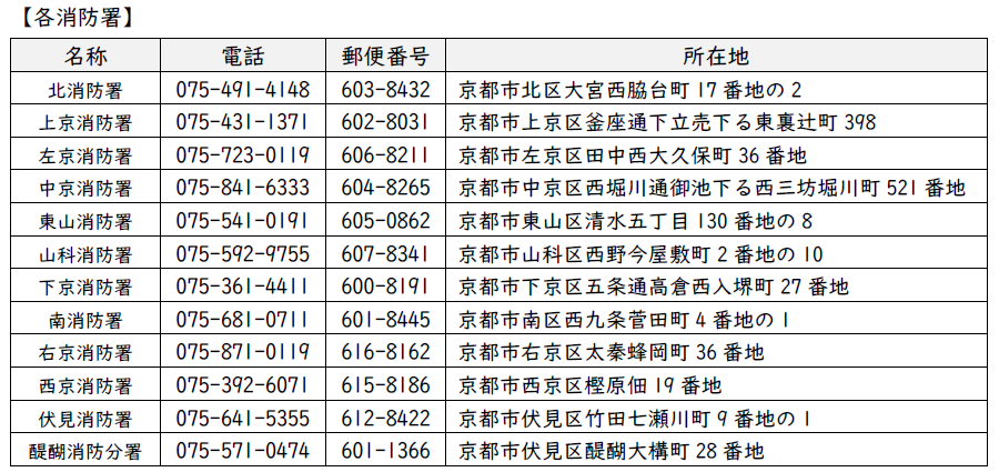 通知書に関するお問い合わせ先は、建物が所在する行政区を管轄する消防署(伏見区醍醐地域については、醍醐消防分署)になります。