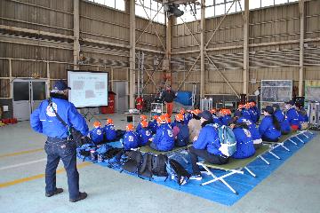 消防ヘリコプターのエンジン始動、離陸を見学し、航空救助員による消防航空隊の業務内容の講義を受けました。