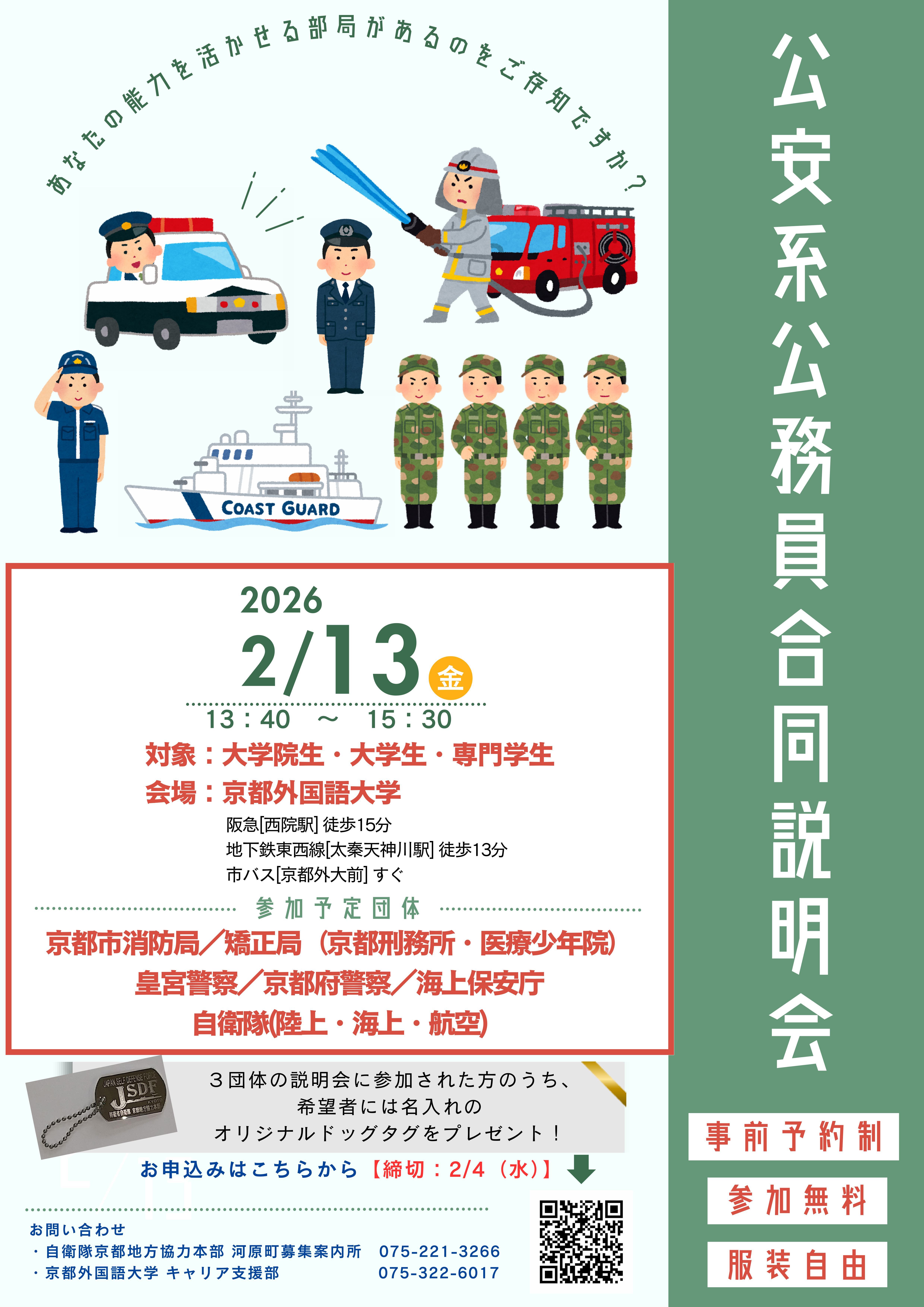 業務説明会の詳細など不明な点がありましたら、消防局人事課(075-212-6654)までお気軽に御連絡ください。