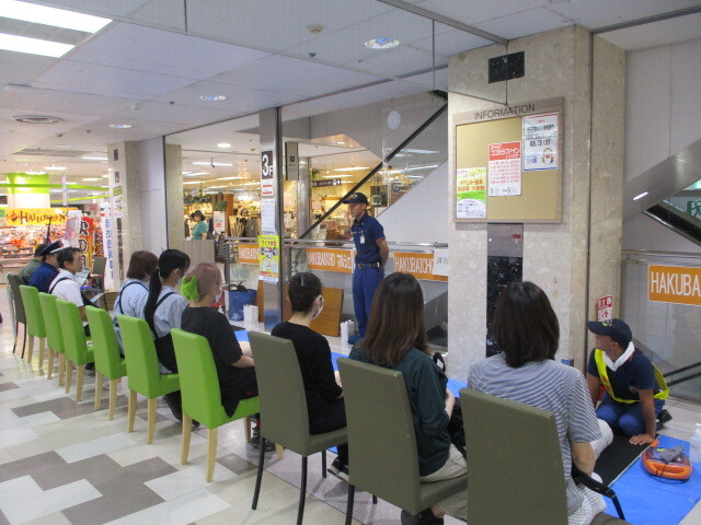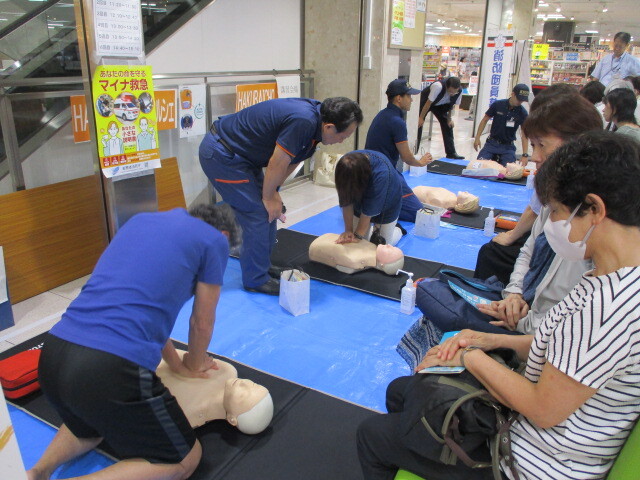 北消防署は救急医療週間の取り組みとして、令和7年9月9日(火曜日)に、イズミヤショッピングセンター白梅町店で従業員や買い物客に対し、胸骨圧迫やAEDの取扱いを学んでもらうためのミニ救命講習を実施しました。
