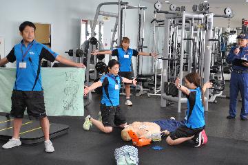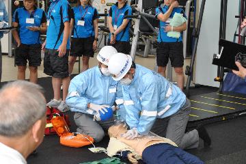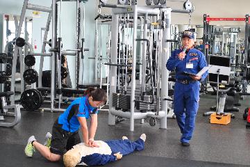 訓練は「トレーニング中の施設利用者が従業員の呼びかけに応答がない状態」でスタート。従業員が即座に初動対応し、早期に119通報しました。