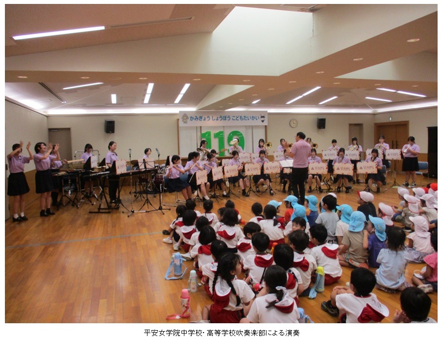 上京消防署ではこの募集に合わせ、令和7年9月10日(水曜日)・11日(木曜日)に「令和7年度上京消防子ども大会」を開催し、区内の幼稚園児や保育園児(合計19園、474名が参加)を対象に、平安女学院中学校・高等学校の吹奏楽部の演奏や、防災ビデオ上映、子ども用防火衣の着装、消防車・救急車の見学、屈折はしご車伸てい訓練の見学を行いました。