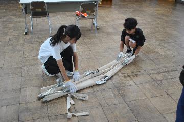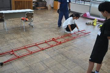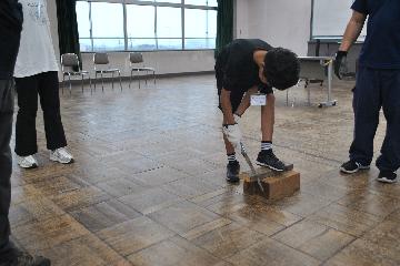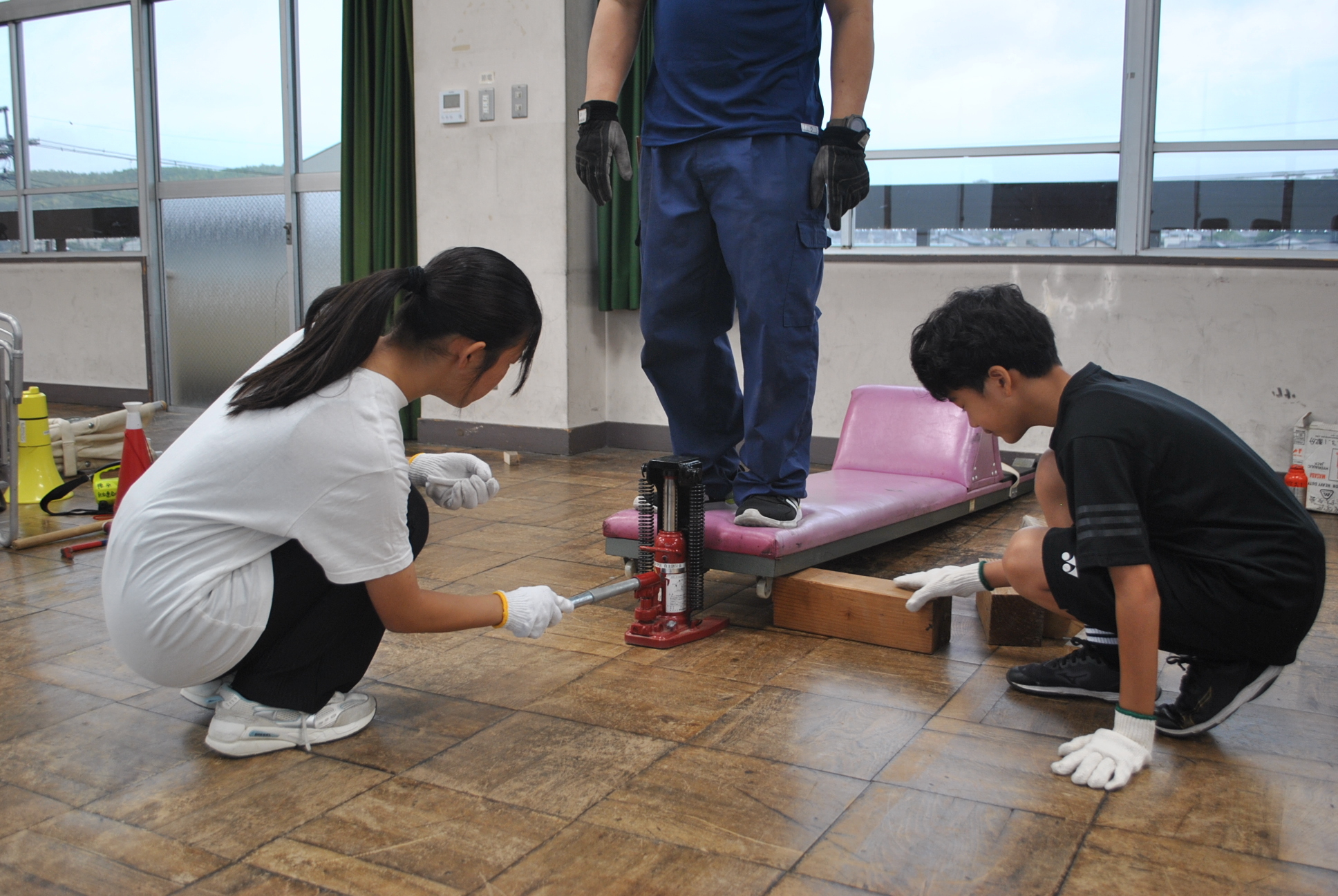 最後に、バール、ジャッキ、あて木を活用し、重量物の持ち上げを体験しました。