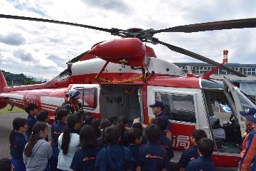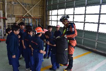 10月は京都市消防ヘリポートを訪問し、消防航空隊から消防ヘリコプターの活動についての説明を聞いたあと、救助訓練を間近で見学しました。頭上で行われる救助訓練は、迫力満点、貴重な体験をすることができました。