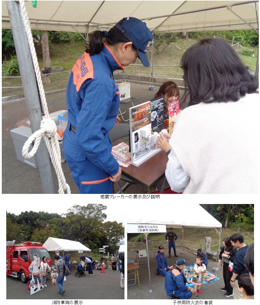 京都市消防局予防部予防課では、10月25日(土曜日)に梅小路公園で開催された「京都やんちゃフェスタ2025」に参加し、消防車両の展示、子供用防火衣の着装及び記念撮影を通じて、子供達に防火を呼びかけるとともに、感震ブレーカーの展示及び説明をしました。