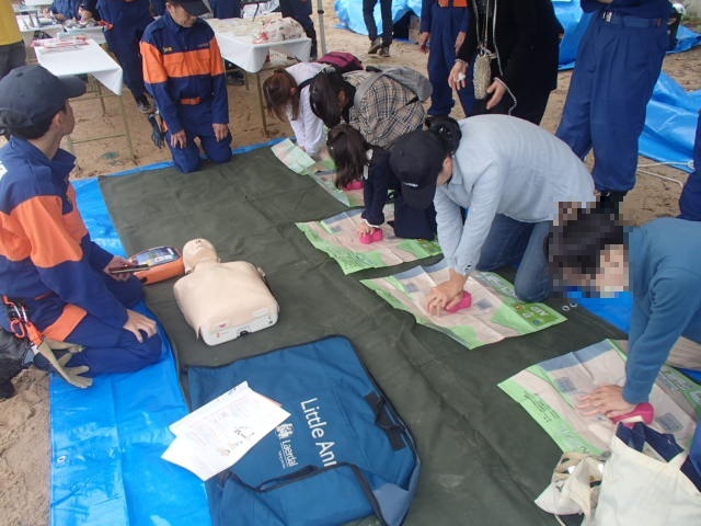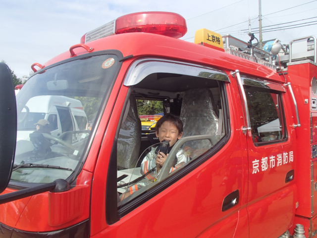 救急体験とアルファ化米の試食、朱雀第二消防分団が所有しているミニ消防車の乗車体験、防火衣・救助服を着て消防車と記念撮影など、いずれのコーナーでも前日から続く雨で足場の悪い中、多くの中京区民の皆様にお越しいただき、消防のことを知っていただいた素晴らしい1日となりました。