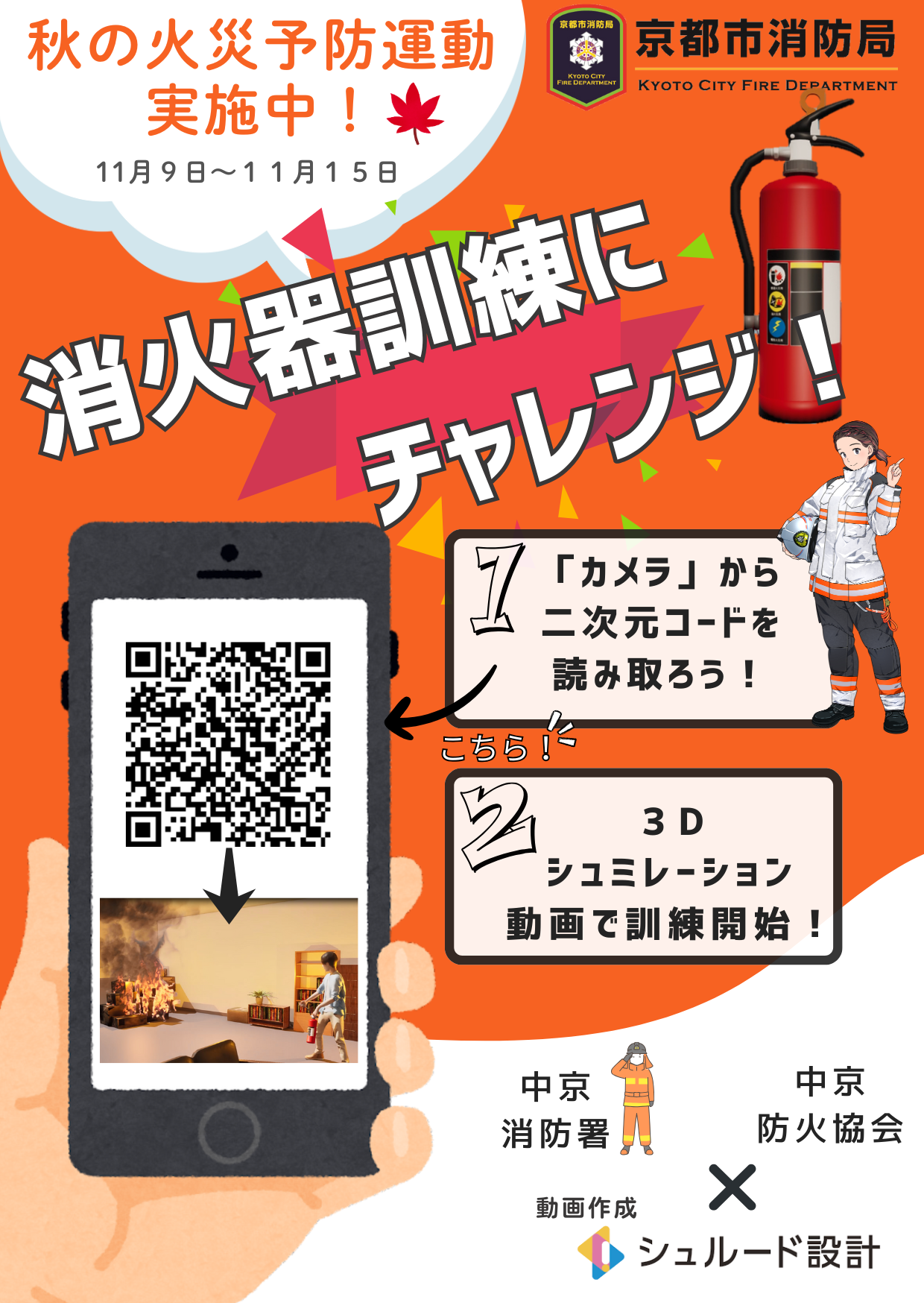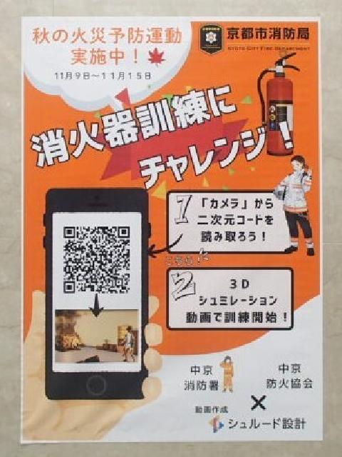 中京消防署とシュルード設計株式会社が共同制作した消火器取扱訓練用3Dシミュレーション動画へのアクセス用二次元コードを掲載したポスターを掲示し、同じ二次元コードを封入したポケットティッシュを来店者に配布して、火災予防啓発と消火器使用方法の周知を行いました。