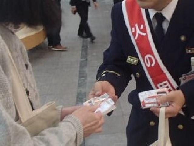 令和7年11月7日、秋の火災予防運動(11月9日~15日)の一環として、ゼスト御池にて街頭広報を実施しました。