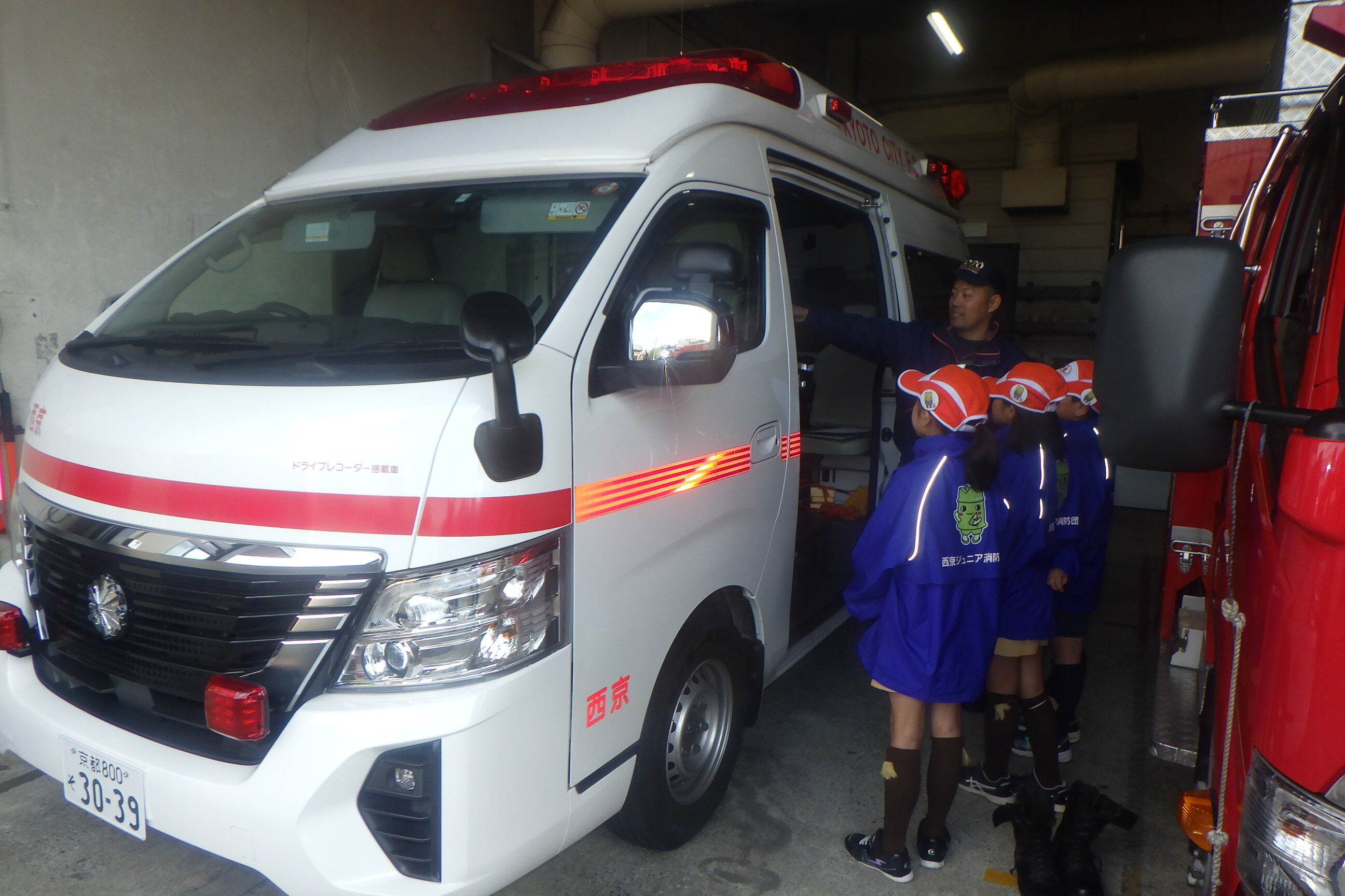 樫原班と桂班の合同で、令和7年11月22日(土曜日)に西京消防署において消防車の資器材について学習しました。数多くある資器材について目を輝かせながら学びました。
