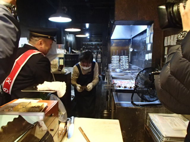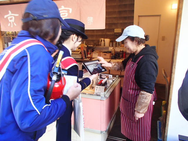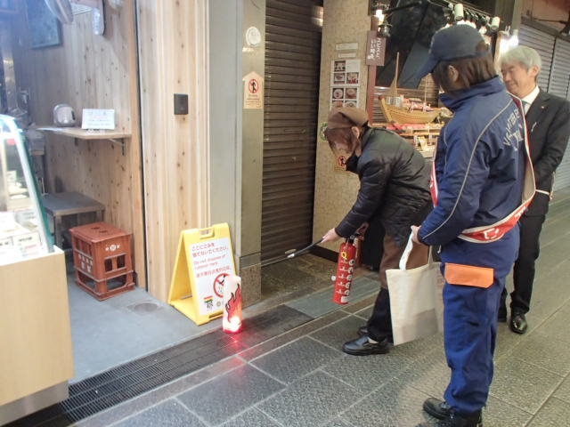 年末の繁忙期で観光客も多く非常に混雑しており、一たび火災が発生すると甚大な事故につながることが予想されます。万が一火災が発生した場合に備え、被害を最小限に抑えるために店舗の方々に初期消火の重要さを伝え、3Dシミュレーション動画で消火器の取扱方法を再度確認していただきました。