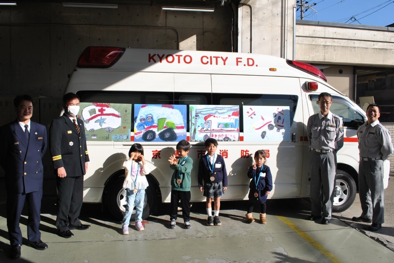 令和7年12月13日(土曜日)右京消防署において、「救急車の絵」を描いてくれた4人の子どもさんに、署長感謝状を贈呈しました。