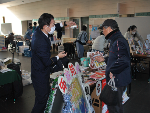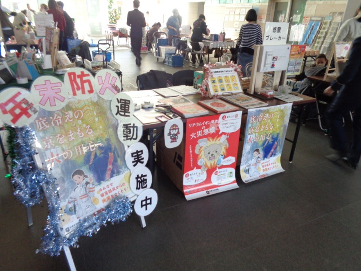 右京消防署では、年末防火運動の一環として、令和7年12月18日(木曜日)にU-ネット(※)が主催する『福祉屋台』で火災予防を呼び掛けました。『福祉屋台』は各事業所が制作した手作りの手芸品、パンやお菓子などの販売会で、年8回、右京区太秦下刑部町のサンサ右京(右京区総合庁舎)のロビーで開催されています。