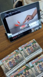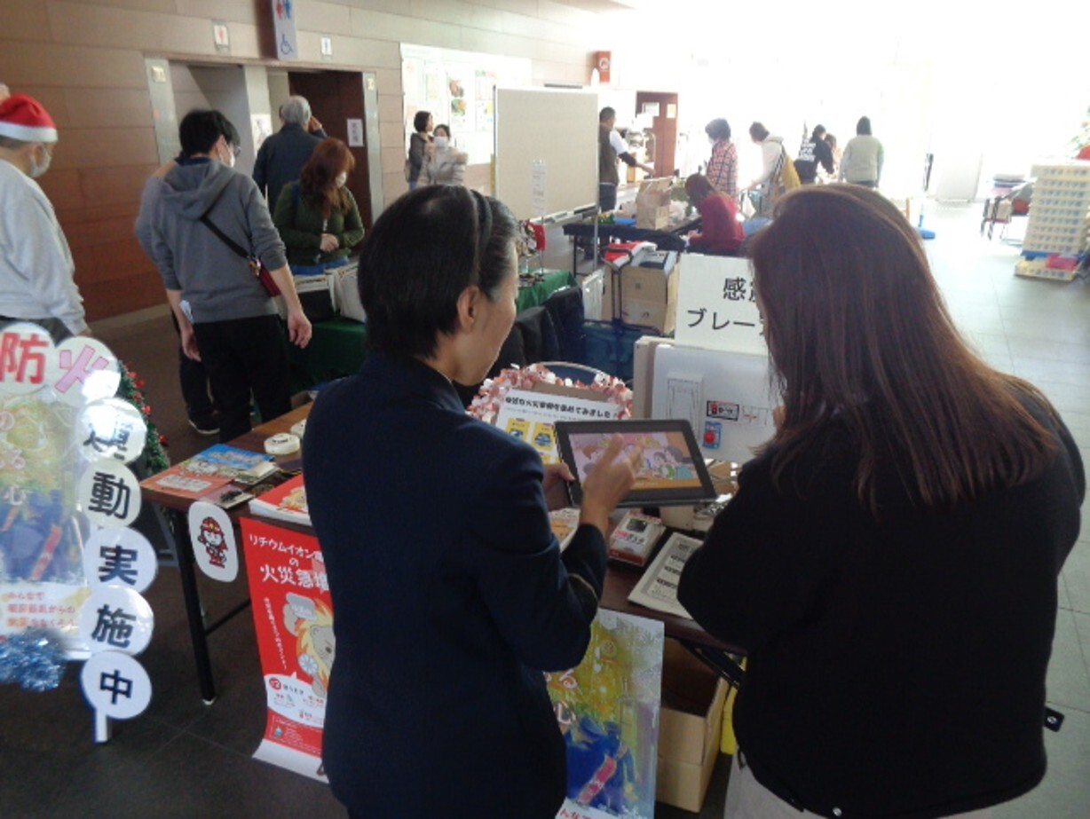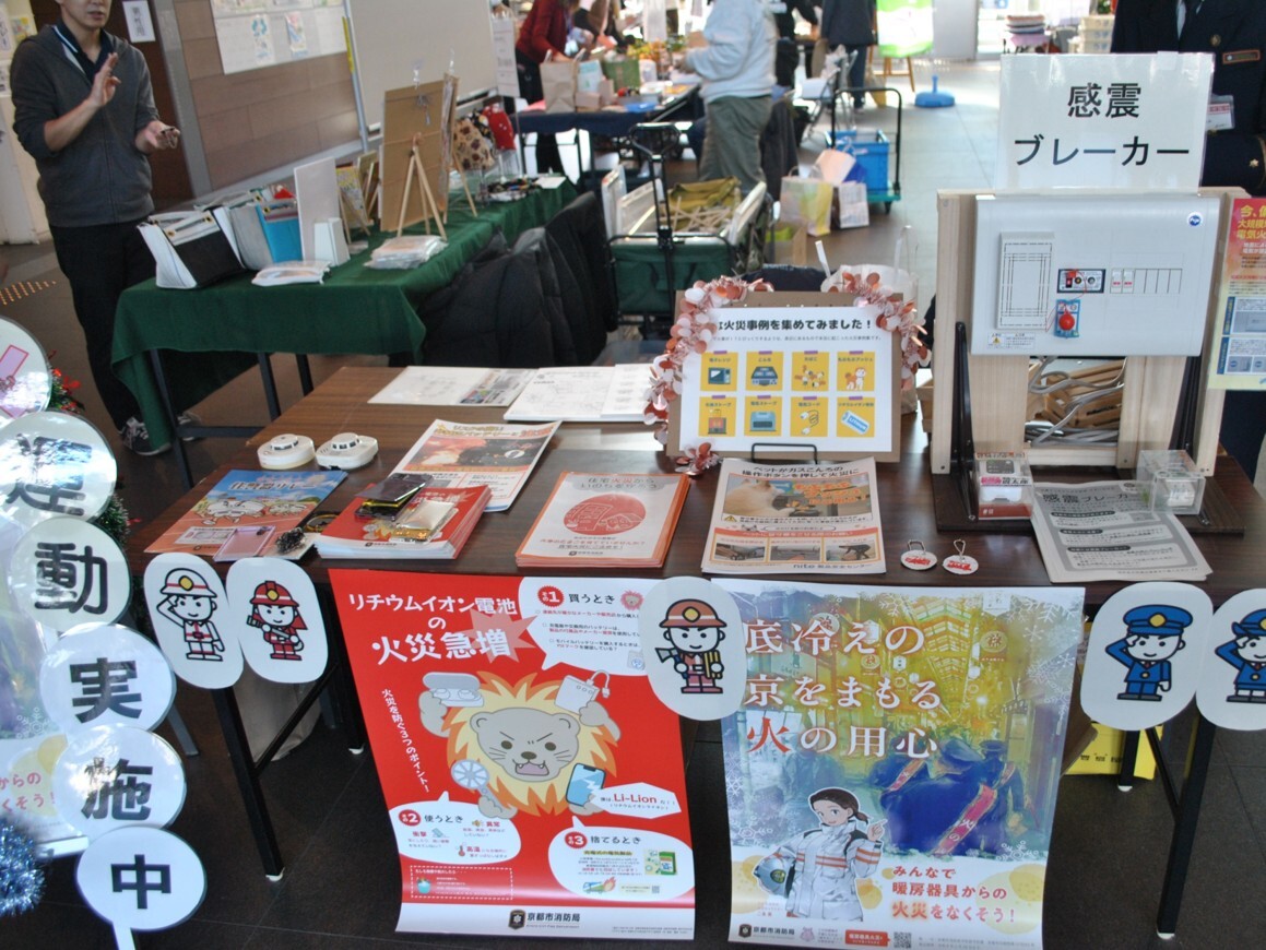 右京消防署のブースでは、利用客の皆様に映像や実物を見てもらいながら、リチウムイオン電池からの出火防止啓発や感震ブレーカーの普及促進などを行いました。