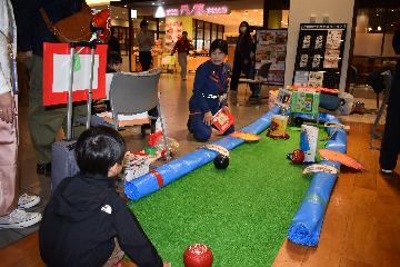 リチウムイオン電池火災の出火防止に対する啓発として、「衝撃」や「高温」といった発火のリスクが描かれた障害物を避けて球を投げる「ミニローンボウルズコーナー」を設けました。こちらも行列ができ沢山の方に体験してもらいました。子供たちには楽しく、大人には分かりやすく身近に起こり得るリチウムイオン電池の出火危険を啓発しました。