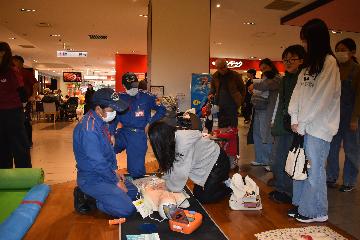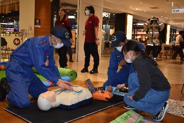 南消防団弘道分団による救急コーナーでは、AEDの取扱いや子供でも体験できるトレーニングツールを使用して心肺蘇生法について学んでもらいました。弘道分団員の熱心な指導の下、沢山の親子に体験していただきました。