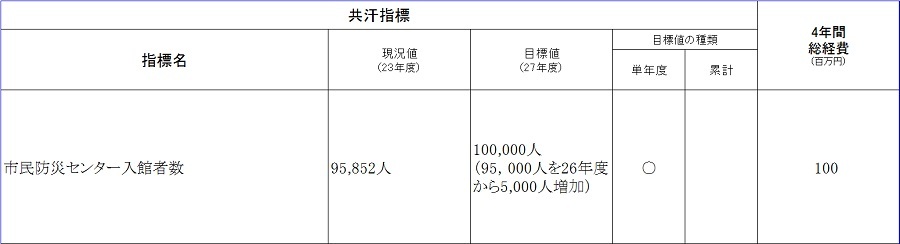 | 25年度 | 100.0 | ・体験施設の機能強化(地震発災・シナリオ型体験コーナー,都市型水害等体験コーナーの新設) | ・体験施設の整備完了,リニューアルオープン(3月) | 100.0 |