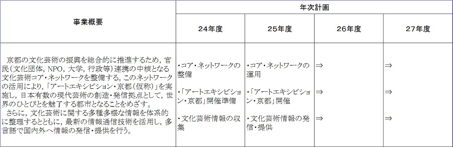 | 26年度 | 4.9 | ・コア・ネットワークの運用 ・「アートエキシビション・京都」開催(「PARASOPHIA:京都国際現代芸術祭」の中で実施) ・文化芸術情報の発信・提供 | ・「京都文化芸術コア・ネットワーク」第2回総会の開催(7月) ・「アートエキシビション・京都」実行委員会の開催2回(10月) ・京都文化芸術オフィシャルサイト「Kyoto Art Box」の運用 ・「アートエキシビション・京都(ART GRID KYOTOプロジェクト)」の開催(3月) | 4.1 |