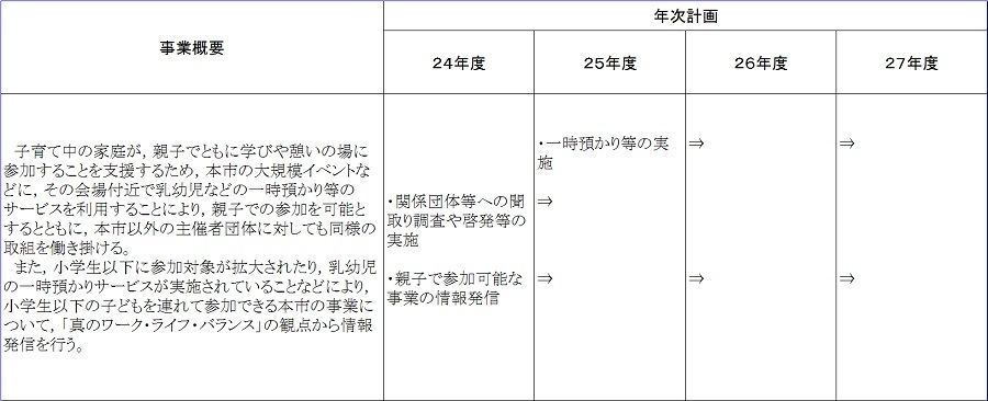 | 27年度 | 0.2 (予算現額) | ・一時預かり等の実施 ・関係団体等への聞取り調査や啓発等の実施 ・親子で参加可能な事業の情報発信 | ・京都style「真のワーク・ライフ・バランス」応援WEBにおいて,親子で参加可能なイベントを掲載 絵本の読み聞かせ「お話を聞くおはよう会」(5月~) 参加者数180人 京都サンガ「真のワーク・ライフ・バランス」推進御優待企画(7月,11月) ・京都サンガの電光掲示板での「真のワーク・ライフ・バランス」の周知,PRブースでの啓発活動(11月) | 0.2 |