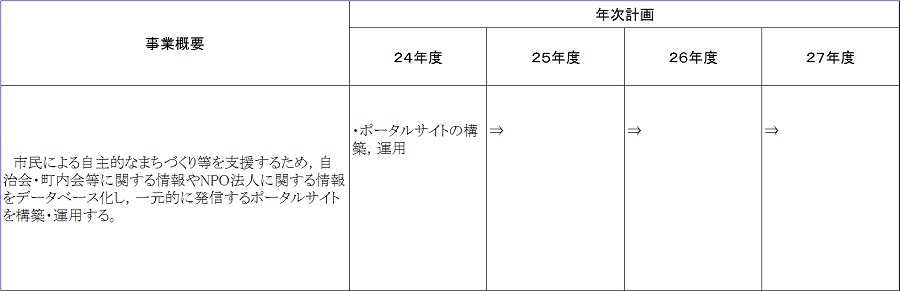 | 24年度 | 4.7 (予算現額) | ・ポータルサイトの構築,運用 | ・「自治会・町内会&NPOおうえんポータルサイト」を開設(11月30日) | 4.6 |