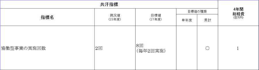 現況値 (計画実施前) | 2回(23年度) | 実績値 | 3回(24年度末) 4回(25年度末) 5回(26年度末) 9回(27年度末) |