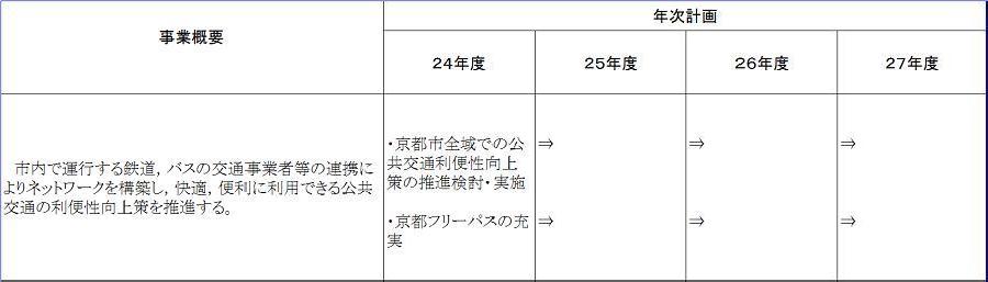 | 24年度 | 5.4 (予算現額) | ・京都市全域での公共交通利便性向上策の推進検討・実施 ・京都フリーパスの充実 | ・公共交通利便性向上策として,四条大宮・出町柳における鉄道・バスの乗換案内の充実(3月) ・市内公共交通事業者との更なる連携を図るため,「歩くまち・京都」協議会を設置(6月) ・「電車・バスでまわる『歩くまち・京都』京都フリーパス」(22年度~) | 5.1 |