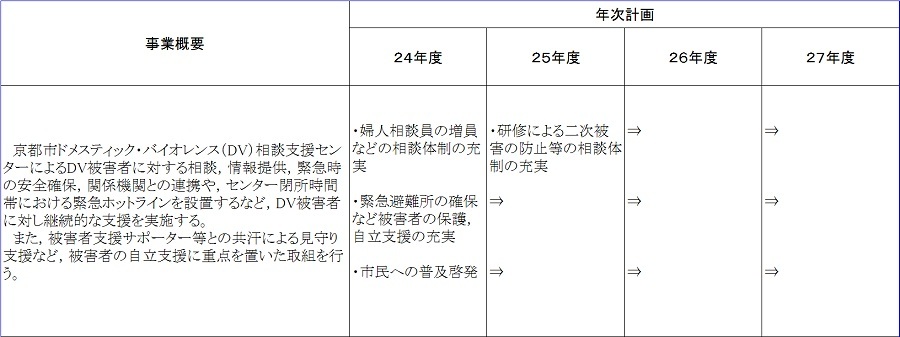 | 24年度 | 52.7 (予算現額) | ・婦人相談員の増員などの相談体制の充実(DV相談支援員(婦人相談員):1名増員) ・緊急避難所の確保など被害者の保護,自立支援の充実 ・市民への普及啓発 | ・京都市DV相談支援センターを運営(23年度~) ・民間シェルター家賃補助事業を継続実施 ・市民への普及啓発 | 48.0 |