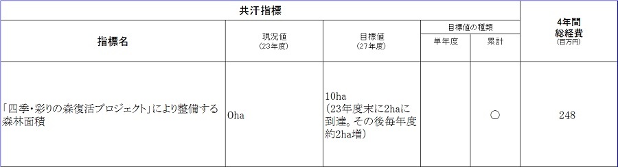 現況値 (計画実施前) | 0ha(22年度末) | 実績値 | 2ha(23年度末) 12.8ha(26年度末) 14.0ha(27年度末) |