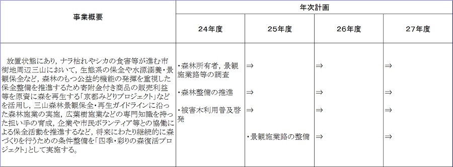 | 25年度 | 60.0 (予算現額) | ・森林整備の推進(鹿ケ谷地区) ・被害木利用普及啓発(企業や市民ボランティア等との協働作業の実施) ・景観施業路の整備(如意ケ岳線(仮称)) | ・専門知識を持った担い手の育成 ・四季の森施業の実施(3.5ha) ・景観施業路(延長=440m)の整備実施 | 37.6 |
