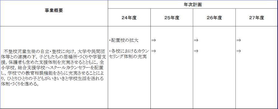 | 24年度 | 212.0 (予算現額) | ・配置校の拡大 ・各校におけるカウンセリング体制の充実 | ・スクールカウンセラーの配置校 148校 | 210.9 |