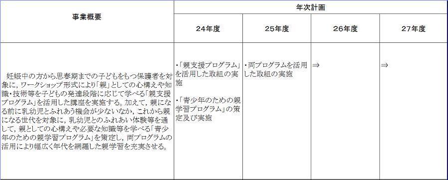 | 24年度 | 3.4 (予算現額) | ・「親支援プログラム」を活用した取組の実施 ・「青少年のための親学習プログラム」の策定及び実施 | ・親支援プログラムを活用した「ほっこり子育てひろば」の実施(22年度~) ・「子どもを共に育む『親支援』プログラム」プロジェクト会議 ・「青少年のための親学習プログラム」の策定(3月) | 1.9 |