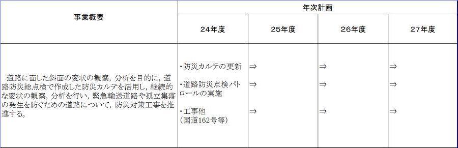 | 26年度 | 1,038.9 | ・道路防災点検パトロールの実施 ・工事他 (国道162号等) | ・道路防災点検パトロールの実施 ・国道367号線工事完了 ・国道162号線工事完了 | 328.7 |