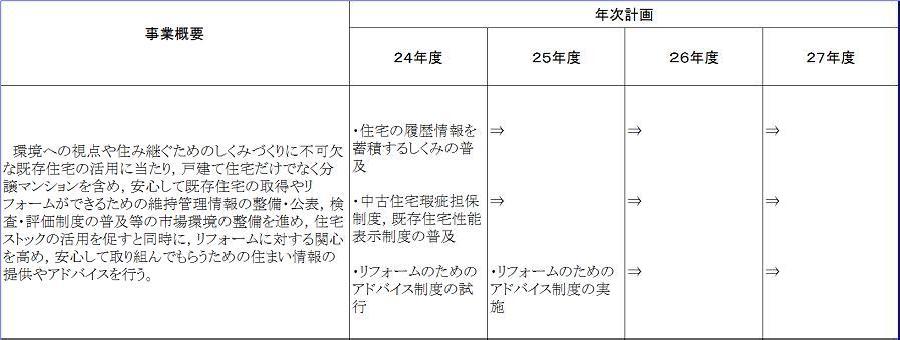 | 25年度 | 3.0 | ・住宅の履歴情報を蓄積するしくみの普及 ・中古住宅瑕疵担保制度,既存住宅性能表示制度の普及 ・リフォーム促進に向けた普及啓発 ・リフォームのためのアドバイス制度の実施 | ・すまいよろず相談において相談業務の実施 ・市民向けすまいスクールの開催(10月26日,11月2日,11月23日) ・出前相談(6月9日,9月14日・15日,11月30日) | 2.7 |