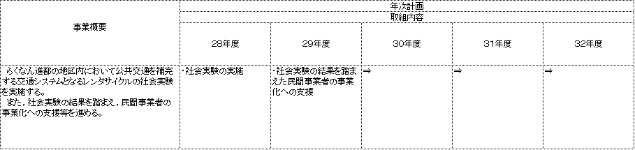 | 30年度 | 0.0 | ・社会実験の結果を踏まえた民間事業者の事業化への支援(周知協力) | ・社会実験受託者である京阪電鉄のレンタサイクル事業の周知協力の実施(4月~3月) | 0.0 |