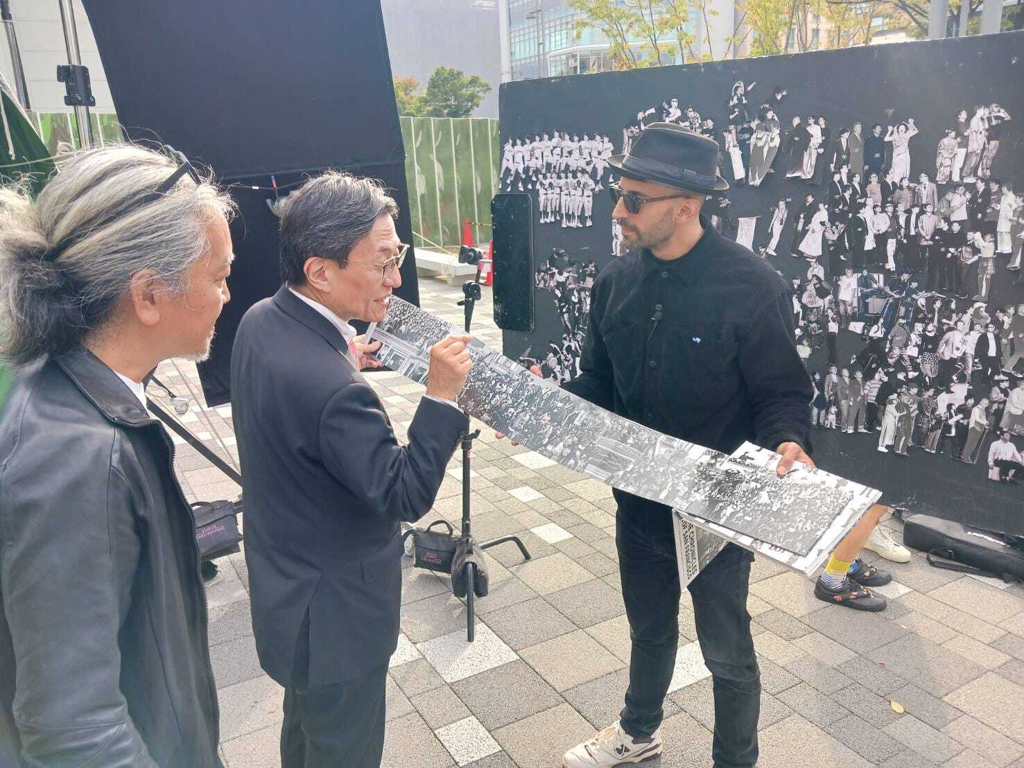 市役所前広場にて、KYOTOGRAPHIE京都国際写真祭の一環で企画された、フランス人アーティストJR氏によるアートプロジェクト「The Chronicles of Kyoto」の撮影が行われ、インタビューに応じました。