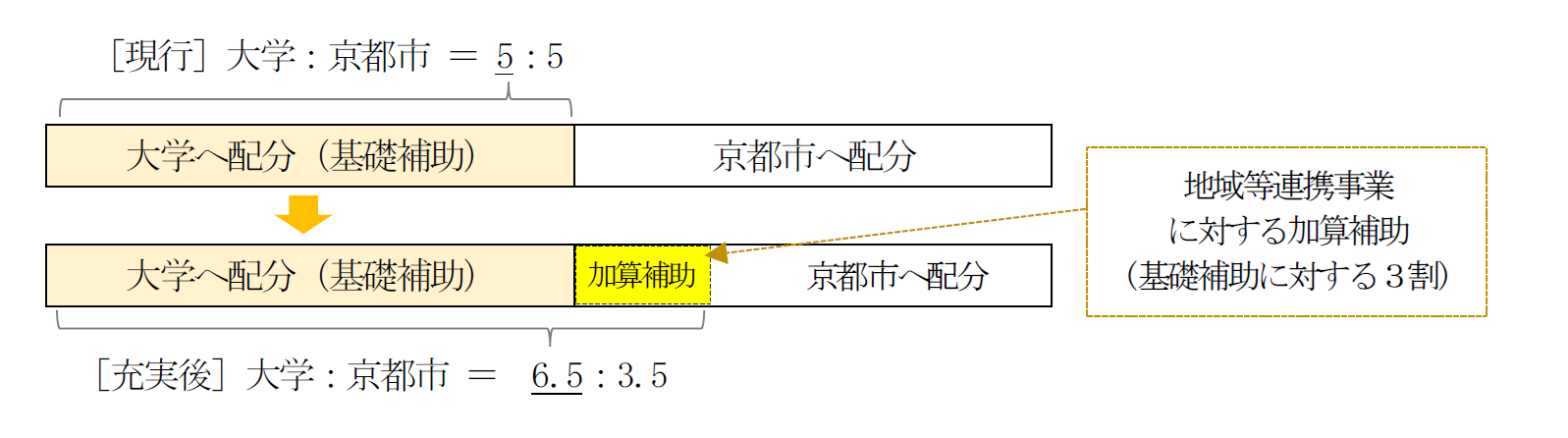 各大学における地域連携等の事業及び本市が実施する「大学のまち京都・学生のまち京都」の推進のための取組に活用します。