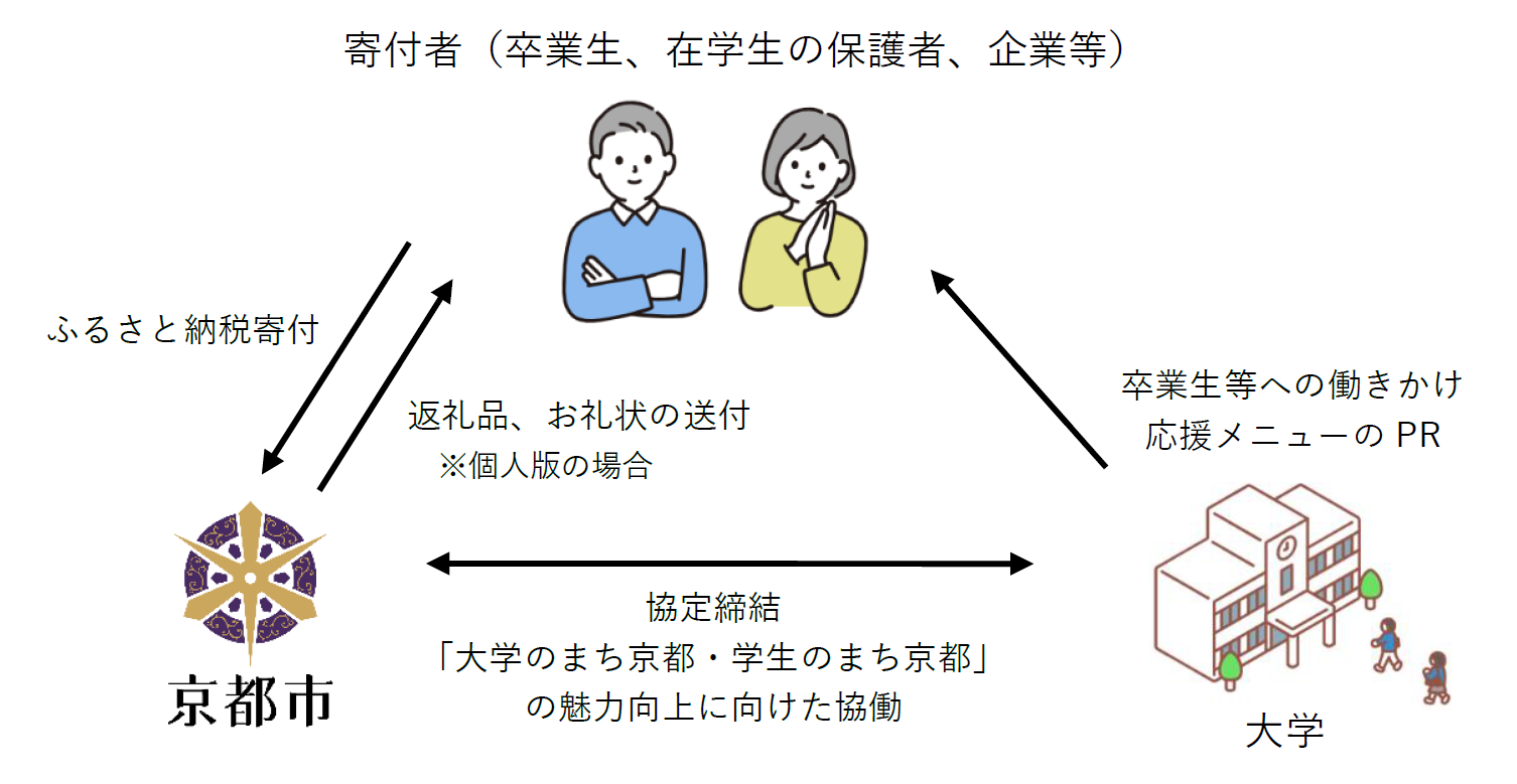 京都市では、大学と連携協定を締結のうえ、ふるさと納税寄付金の使い道に「京都の大学・学生の活動を応援」のメニューを開設しており、ふるさと納税の寄付の促進や寄付金を活用した大学における地域連携等の推進に取り組んでいます。