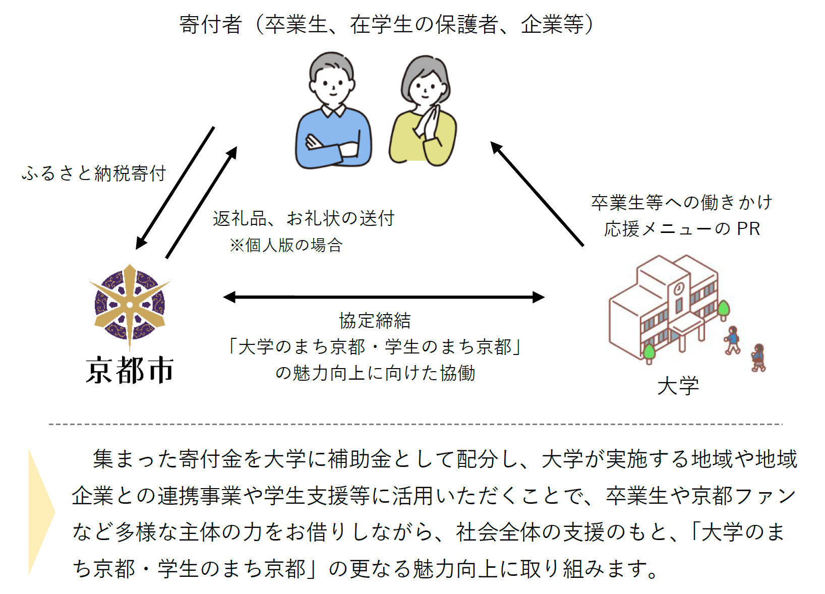 ▶ 集まった寄付金を大学に補助金として配分し、大学が実施する地域や地域企業との連携事業や学生支援等に活用いただくことで、卒業生や京都ファンなど多様な主体の力をお借りしながら、社会全体の支援のもと、「大学のまち京都・学生のまち京都」の更なる魅力向上に取り組みます。